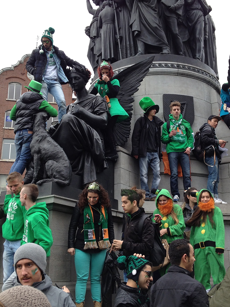 I had to crane my neck to see the revelers who had grappled their way up the imposing, angel-flanked statue of a long-dead nationalist leader. The memorial is still scarred with bullet holes following the Easter Rising of 1916, when Irish republicans, fighting for independence from the United Kingdom, were decisively routed by the Brits. When I arrived in the city days before St. Patty’s, one of the first things I asked my cab driver was why there were yellow flowers sprouting from the iron figures. “Ah, dumb kids,” was his response, and he explained to me that students routinely pack those old wounds with fresh flowers. The morning of St. Patty’s, as the entire city wandered from the extravagant parade, which had bafflingly included the Owasso High School band amid a giant, green Celtic Tiger float and rolling Viking warships. It was hard to see the yellow flowers past the climbing, grinning faces posing together and snapping the moment with outstretched phone-arms.