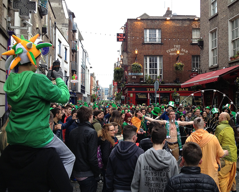 Dublin on St. Patty’s is a green-bedecked crush of people filtering through neoclassical streets, wearing bouncy Leprechaun hats, cheap football scarves and plastic shamrock bling. The colorful accents and rapid-fire languages were proof that I was not the only foreigner picking my way down O’Connell Street, riding the electric wave of insanity into which the city had slipped. Barricades guarded by police in bright yellow sleeves kept the tipsy cattle moving; the columns of the old Georgian buildings were cast in emerald green from well-placed spotlights; and memorial fountains overflowed with foam. A chalk sign in front of a restaurant read “Soup of the Day: Whiskey.”
