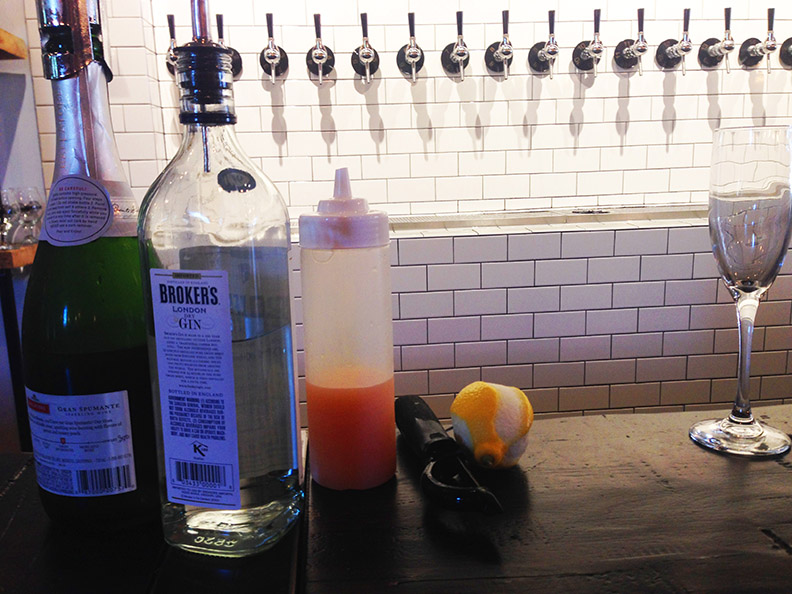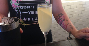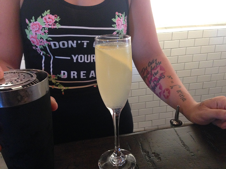 Next up was something with a bit more of a kick, yet still capable of wetting your whistle in the summer. The A.D., named after owner Micah Andrews’ wife, Amber Dawn, is made with Broker’s Gin and grapefruit juice, then topped with champagne and a lemon peel garnish. It may have started as Amber Dawn’s favorite drink, but it’s come to be quite popular with the patrons. Fairly sour with notes of sweetness from the champagne, this one will make you pucker up but leave you thirsty for more.